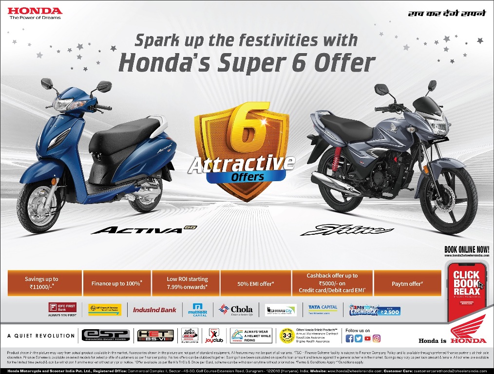 Elaborating on Honda’s exciting offers for customers, Mr. Yadvinder Singh Guleria, Director – Sales & Marketing, Honda Motorcycle & Scooter India Pvt. Ltd. said, “In the new normal, many new customers are choosing personal mobility, especially two-wheelers over public transport. Recognizing that this festival is unlike any before, Honda’s committed efforts to ensure Safety First across all its network via its comprehensive sanitization, social distancing measures has given added confidence to our customers. Now, with the start of Navratri, we are witnessing increase in enquiries, bookings and test rides at showroom. This festival, Honda is giving wings to its customers with increased affordability and attractive savings. Adding to the excitement of Honda’s expanded BS-VI lineup is our festival surprise – the Honda Super 6 offer. For Honda 2Wheeler customers, now is the best time to ride home their dream Honda 2Wheeler with big savings up to Rs. 11,000.”
