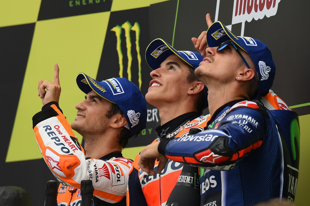 With all riders choosing wet weather tyres from the start and then coming into the pits to change, it took a while for the race to settle down and positions to become clear in-front of the 87,541 fans at trackside. Dani Pedrosa (Repsol Honda Team) made his way through the field – after re-joining in eighth – to take second place. Third went to a hard-charging Maverick Viñales (Movistar Yamaha MotoGP), the Spaniard was 13th after his pit-stop and pushed through to take third, his charge being highlighted as he set the fastest lap of the race on the 17th circulation. Valentino Rossi (Movistar Yamaha MotoGP) was one of the last riders to come in and change bikes and he then had to set about passing other riders as he returned to the track in 14th. He did this with some impressive overtaking manoeuvres as he pushed his way to fourth at the chequered flag.