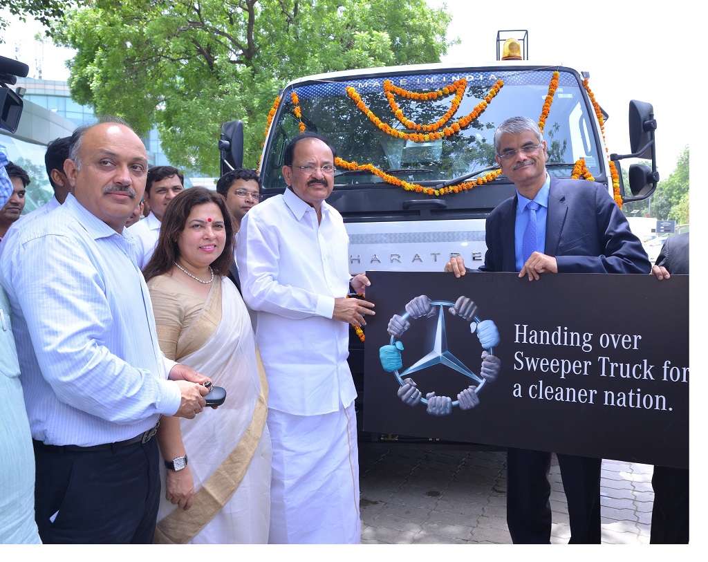New Delhi: The country’s largest luxury car manufacturer Mercedes-Benz today donated a state-of-the-art vacuum cleaning truck to the New Delhi Municipal Council (NDMC) as part of its Corporate Social initiatives. The BharatBenz-based Road Sweeper truck will be effective in reducing dust levels in Delhi by vacuum cleaning the roads. With road dust emerging as one of the key contributors of air pollution in Delhi, the deployment of the Mercedes-Benz donated Road Sweeper truck will assist in making Delhi’s roads and air cleaner than before. Suhas Kadlaskar, Vice President- Human Resource and Corporate Affairs, Mercedes-Benz India presented this Road Sweeper truck to Shri M. Venkaiah Naidu, Minister for Urban Development, Government of India, in the presence of Shri Naresh Kumar, Chairman, New Delhi Municipal Council (NDMC), in New Delhi today.
