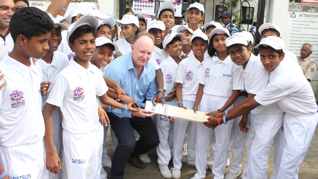 With team India’s first match in ICC WT20 series from Nagpur today, children wished their favourite team and crickting legends, luck for the series. The wishes were written on a cricket bat and presented to Mr. Campbell Jamieson, General Manager, ICC. The children were from Chandrapur and are part of Datsun Flagbearers programme.