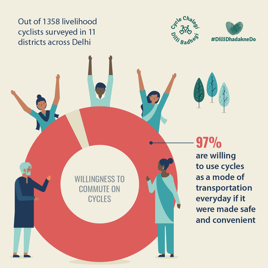 A whopping 97% of respondents out of nearly 1400 people are willing to use cycles as a mode of daily transport, highlights a perception study conducted as part of #DilliDhadakneDo, a citizens-led initiative. The survey indicates that a lack of safe and convenient cycling infrastructure, absence of dedicated cycling lanes, poor air quality and unruly traffic are deterrents to more citizens taking up cycling in Delhi.