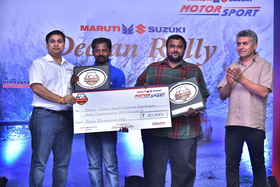 Karthick Maruthi and his co-driver S Sankar Anand, zoomed past the others to reach the finishing line as they took first place in the Deccan Rally, the second round of theNational Super League TSD Rally Championship 2016 that concluded in Goa yesterday. The team concluded in style in their equally stylish winning car, the Maruti Suzuki Vitara Brezza. The rally saw Sachin Singh and Prakash M in second spot in their Maruti Suzuki Swift followed by Ajgar Ali and M Musthafa who came in third driving their S-Cross.