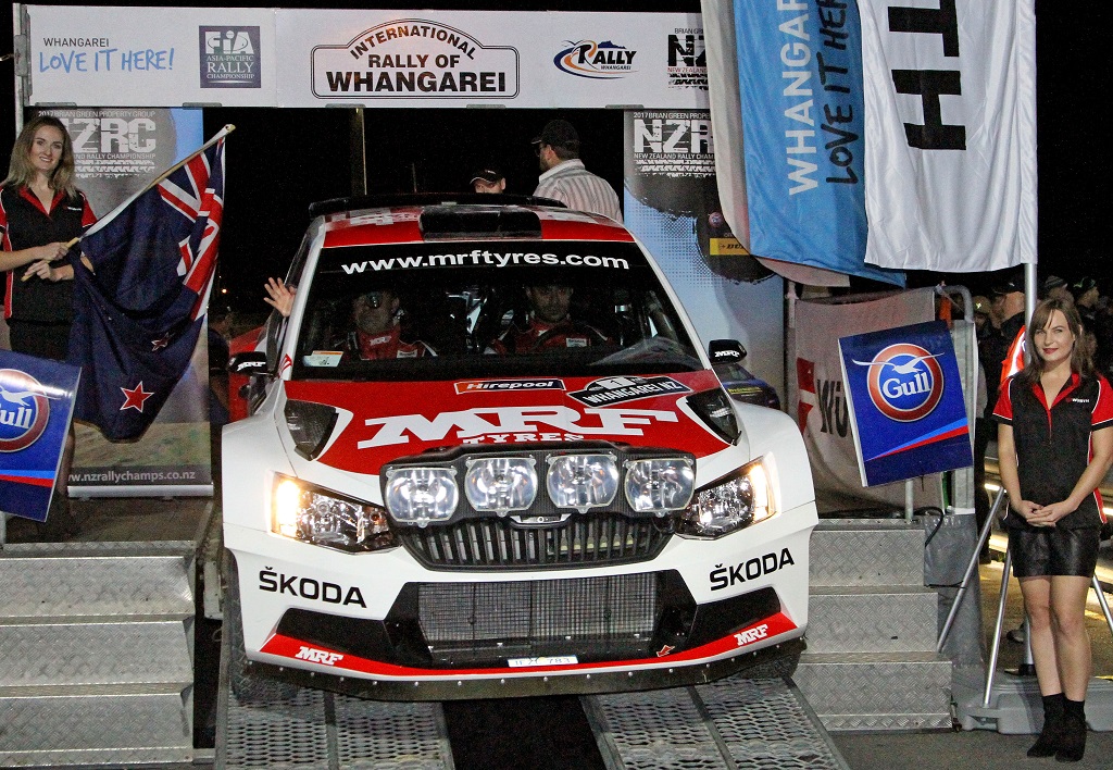 New Delhi, April 28, 2017: India’s Gaurav Gill of Team MRF Tyres, the defending champion, put the hammer down with a scorching night run of the Super Special Stage and led team-mate Ole Christian Veiby by 2.5 seconds as the International Rally of Whangarei, the first round of the FIA Asia Pacific Rally Championship got underway here on Friday.