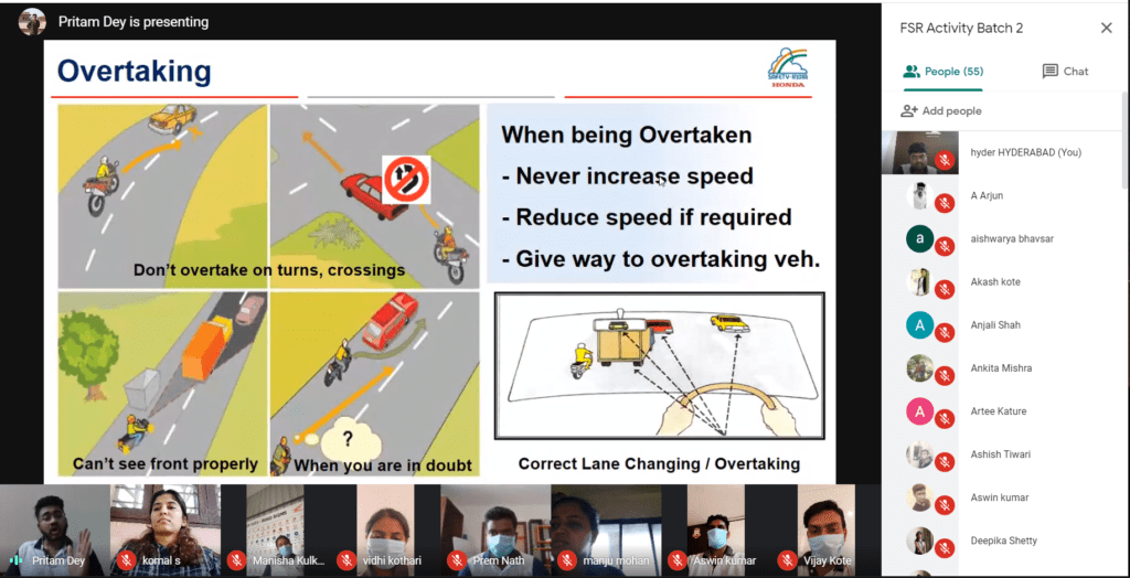Keeping it informative yet engaging, Honda’s road safety instructors utilized Road Safety Learning Programs to enhance the retention of Road Safety awareness. The training focused on explaining the importance of safe riding etiquettes, safety gears, road rules, traffic signs through a mix of theory, videos and case studies. The 1-hour long video session was followed by a Question &Answer session for resolving queries on various topics.