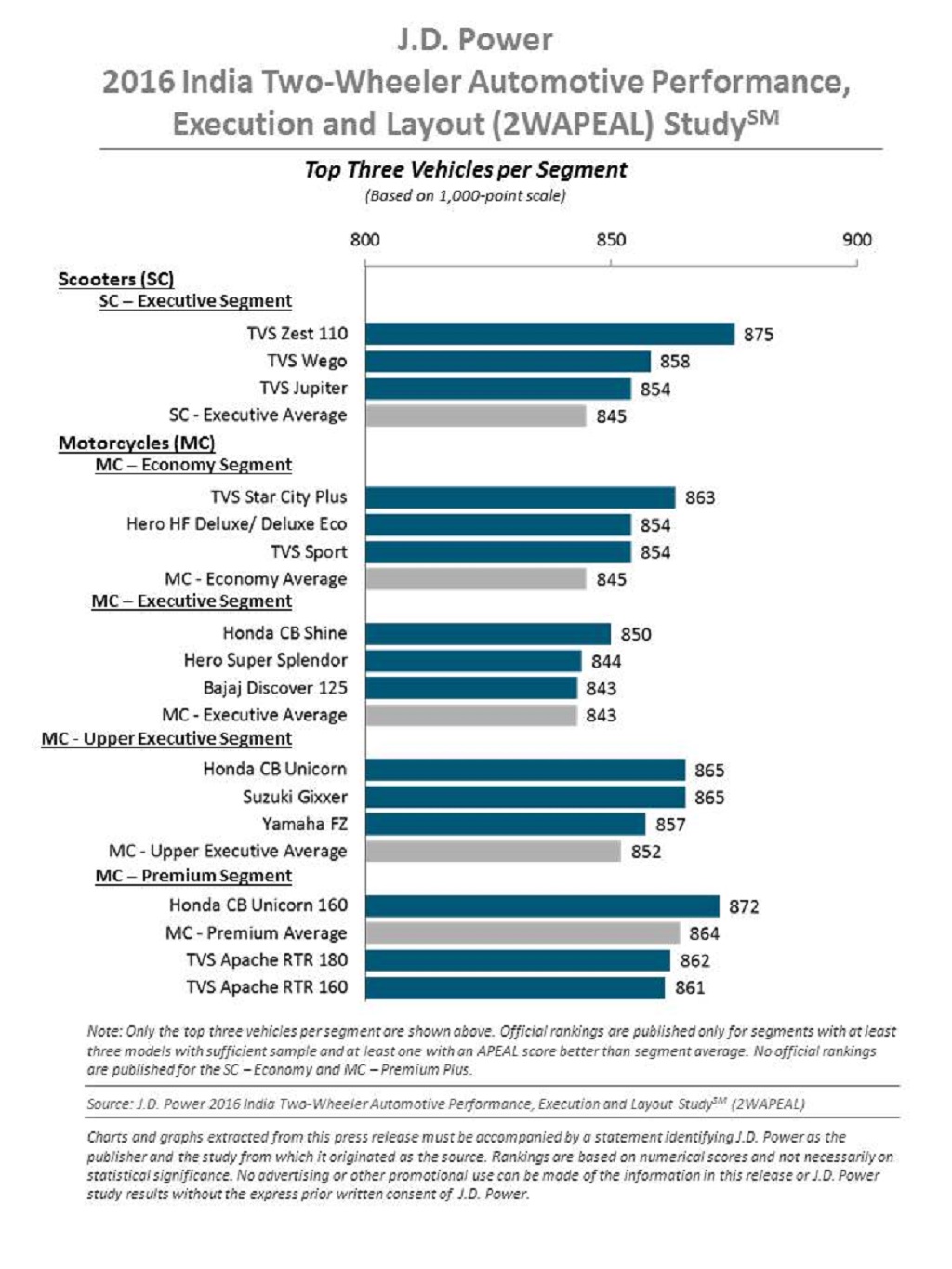 - Overall satisfaction with two-wheeler APEAL is 846, a slight 2-point drop from 2015. In terms of the two vehicle segment, the APEAL score averages 846 for scooters and 847 for motorcycles.