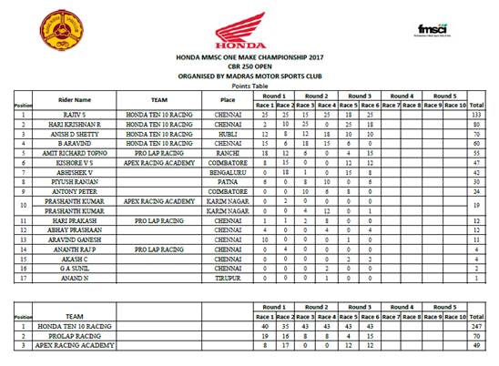 - CBR 250R Open Championship: Hari Krishnan (1st – Race 1) Honda sponsored ARRC rider Rajiv S. (1st – Race 2)