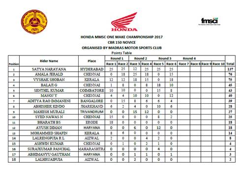 - Round 4 of 10th edition Honda One Make Race to be held at Madras Motor Race Track Chennai, from September 7th -10th