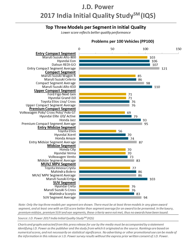 The 2017 India Initial Quality Study (IQS) is based on responses from 8,578 new-vehicle owners who purchased their vehicle from November 2016 through July 2017. The study includes 83 models from 17 makes. The study was fielded from May through September 2017 in 40 cities across India.