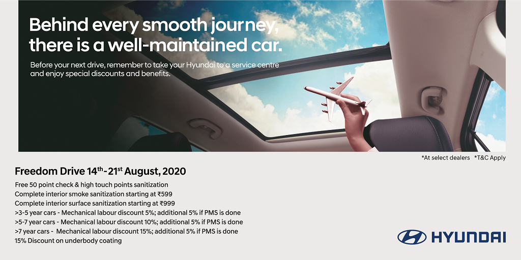 Mumbai, August 14, 2020: Hyundai Motor India Ltd., country’s first smart mobility solutions provider and largest exporter since inception, today announced the commencement of Nationwide Freedom Drive across all Hyundai workshops, with an objective to make customers mindful of Periodic Maintenance Schedule. Customers can avail special offers on Labour, Car Sanitization & Under body coating for their Hyundai cars from 14th – 21stAugust, 2020.