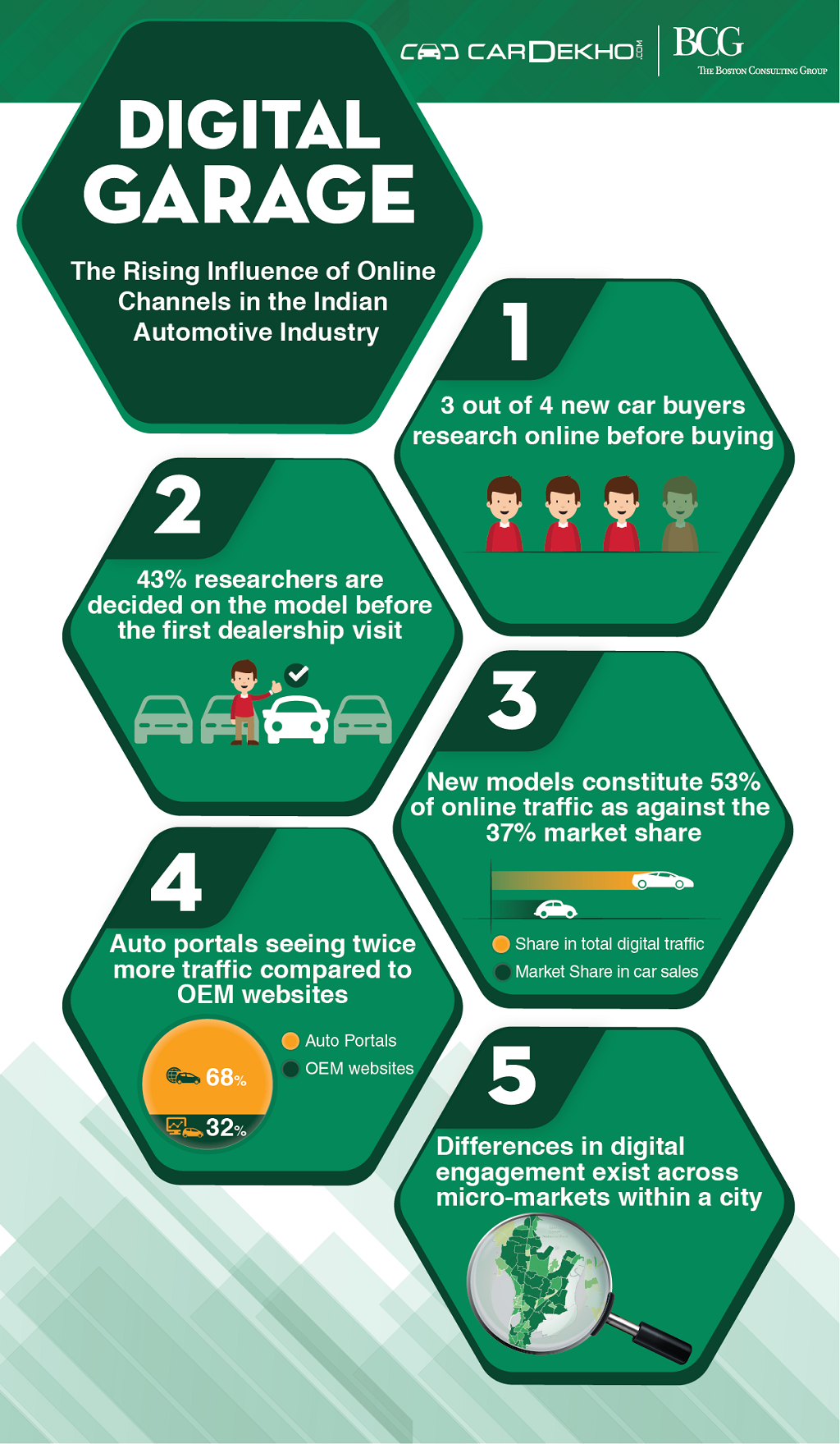 Mumbai, February 28, 2017: India is undergoing a digital transformation, owing to the technological advancements in mobile gadgets and proliferation of wireless data networks. The number of internet users is expected to be around 650 million by 2020, a staggering number, which is forcing various industrial sectors to alter their approach towards marketing and sales. This transformation is distinctly evident in the automotive industry. The Boston Consulting Group (BCG) along with India’s leading online car search venture CarDekho, today, released a report titled ‘Digital garage – get ready for the digital ride’ that focuses on the rising influence of online channels in automotive industry.