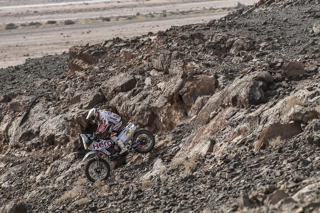 Erfoud, Morocco May 11, 2017 Hero MotoSports Team Rally riders, Joaquim Rodrigues and C S Santosh have overcome the hardest stage of the Afriquia Merzouga Rally in Morocco. The 2 day Marathon stage tested the riders with zones that were quite dangerous and very technical, thus challenging the riders’ bike control to the maximum.