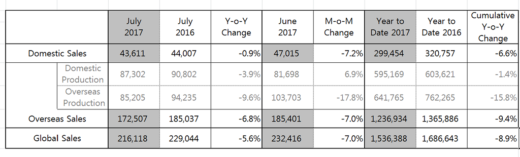 Domestic market sales decreased by 0.9% compared to the previous year, resulting 43,611 units sold, which is comparable to July 2016 when Kia benefited from newly launched vehicles such as Cadenza and Niro. Overseas sales also decreased by 6.8% compared to the previous year, posting 172,507 units, due in large part to continued sales fall in the Chinese market.