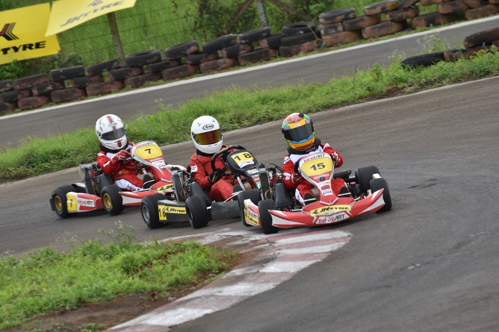 Donison of BPC Racing, who had won all three earlier rounds, couldn’t come to terms with the wet and slippery conditions on the track and lost his edge in the Senior Max category. He zipped into the parcferme area in the scrutiny bay as he felt that he had a problem with his kart.