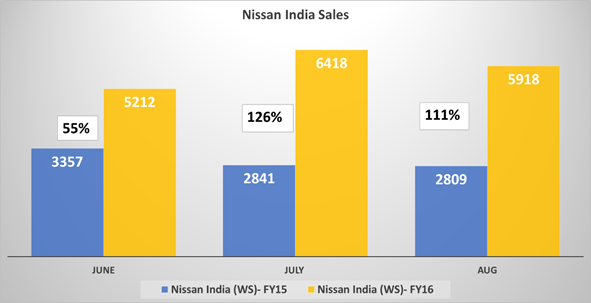 Nissan Motor India Pvt. Ltd. today reported domestic sales of 5,918 vehicles in August 2016 versus 2,809 units a year ago in August 2015. The Japanese carmaker reported 111 percent year-on-year growth in sales for August 2016.