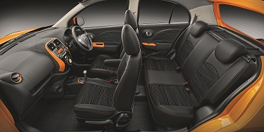 The New Micra’s interior accentuates the car’s sporty side with its striking new European black theme with enhanced piano black finish accompanied by orange accents on the seats, dashboard and arm rest. The ambience of the New Micra was conceived to energize the mood of its occupants. The car also has a new 2-DIN audio system with Bluetooth as a standard feature for tech savvy customers apart from a host of other exciting features like steering mounted controls, push stop start and i-key.