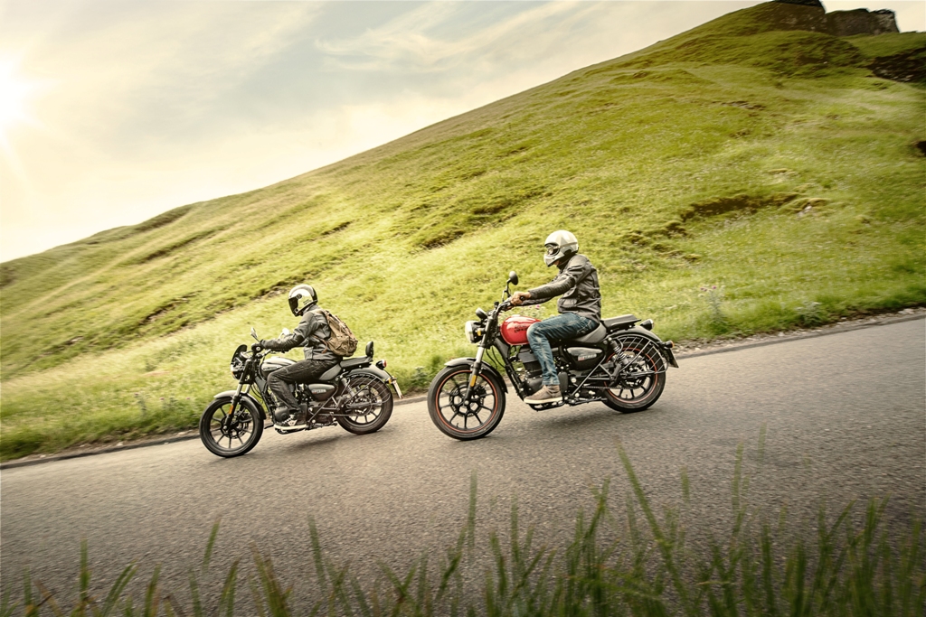 The Meteor 350 is supported by a suite of Genuine Motorcycle Accessories, designed and developed for it, which can be added when ordering the motorcycle. The range includes functional accessories, such as the passenger backrest, touring screens, luggage options, robust engine and sump guards, as well as classic styling embellishments, including a variety of brushed stainless steel and black powder-coated slip-on silencer options and beautifully crafted touring seats, all of which come with a 3-year warranty. For further individual self-expression, a selection of riding gear, including helmets in complementary colours, t-shirts, and personal accessories have also been developed around the Meteor and cruiser lifestyle.