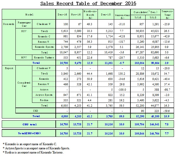 SsangYong Motor Company(CEO Choi Johng-sik; www.smotor.com), part of the Mahindra Group, today announced that the company recorded its highest ever annual sales in 2016 in 14 years, posting a record-high monthly sales in December 2016.