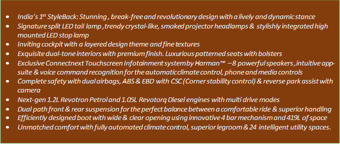 Unveiling the Tata TIGOR, Mr. Guenter Butschek, CEO & MD, Tata Motors, said, “With our passion to shape the mobility of tomorrow, we have constantly pushed the boundaries of automotive engineering by creating new category vehicles. This pursuit of something different led us to what we call ‘STYLEBACK’ – as our re-definition of the compact sedan category. The TIGOR is not just a new product; it is a true reflection of our legacy of creating something unexpected, setting new trends. It expresses a youthful mixture of design, style and attitude. It is designed to offer high performance and connects modern India and its global citizens. Today, with the launch of TIGOR, we expand our product portfolio, invite new customers and reinforce our spirited comeback in the passenger vehicle market.”