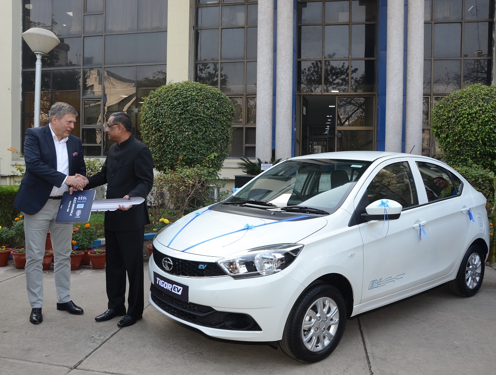 Thursday, December 14, 2017: Tata Motors today delivered the first set of Tigor Electric Vehicles (EVs) to state-run Energy Efficiency Services Limited (EESL) as part of their initiative to procure 10,000 electric vehicles. Guenter Butschek, CEO & MD, Tata Motors handed over the keys of the Tigor EVs to Saurabh Kumar, Managing Director, EESL, accompanied by the senior management teams from both the companies.
