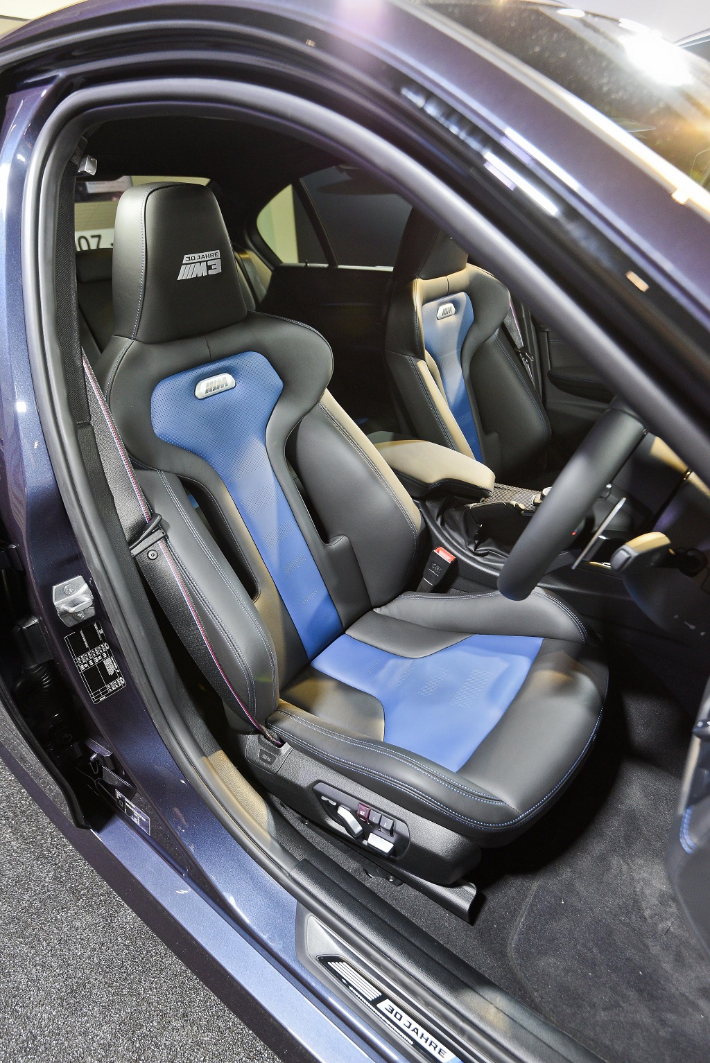 The logo “30 Years M3” on the front doorsills reminds both driver and front passenger of the BMW M company icon’s unique history. The wording “30 Years M3 1/500” on the carbon fibre interior trim strip of the instrument panel gives indication of the exclusiveness of the BMW M3 “30 Years M3”, which is limited to 500 cars worldwide. “30 Years M3” is embroidered into the front headrests.