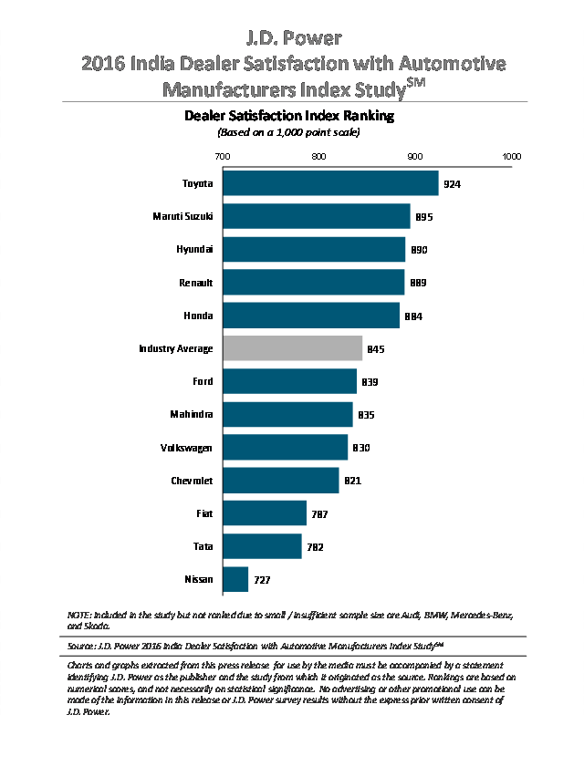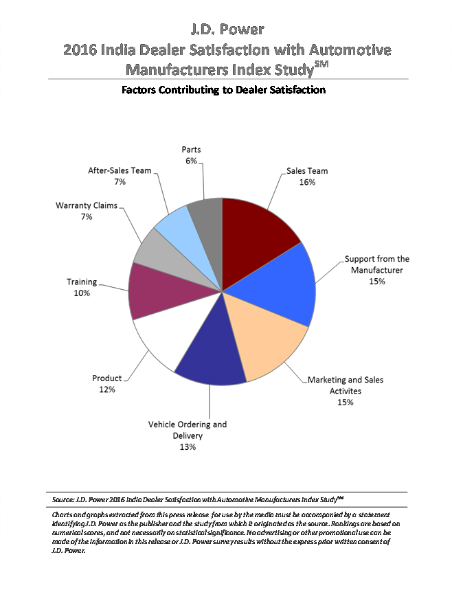 Now in its sixth year, the study measures dealer satisfaction with vehicle manufacturers or importers in India and identifies dealer attitudes regarding the automotive retail business. Overall dealer satisfaction is determined by examining nine factors: marketing and sales activities; product; vehicle ordering and delivery; sales team; parts; warranty claims; after-sales team; training; and support from the manufacturer.