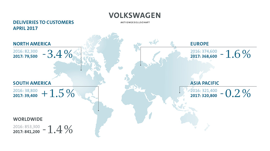In Europe, the Group handed 1.5 million vehicles over to its customers in the year to April (+2.8 percent) including 368,600 in April (-1.6 percent). 305,000 vehicles (-3.9 percent) were handed over to customers in Western Europe in April; Group deliveries therefore developed better than the market as a whole. 113,200 vehicles (-7.2 percent) were handed over to customers in Germany. In Central and Eastern Europe, strong growth has been observed since the beginning of the year. Compared with the corresponding period of the previous year, Group deliveries grew by 12.0 percent to 233,200 vehicles. In April, the Group boosted deliveries in the region by 11.1 percent to 63,600 vehicles.
